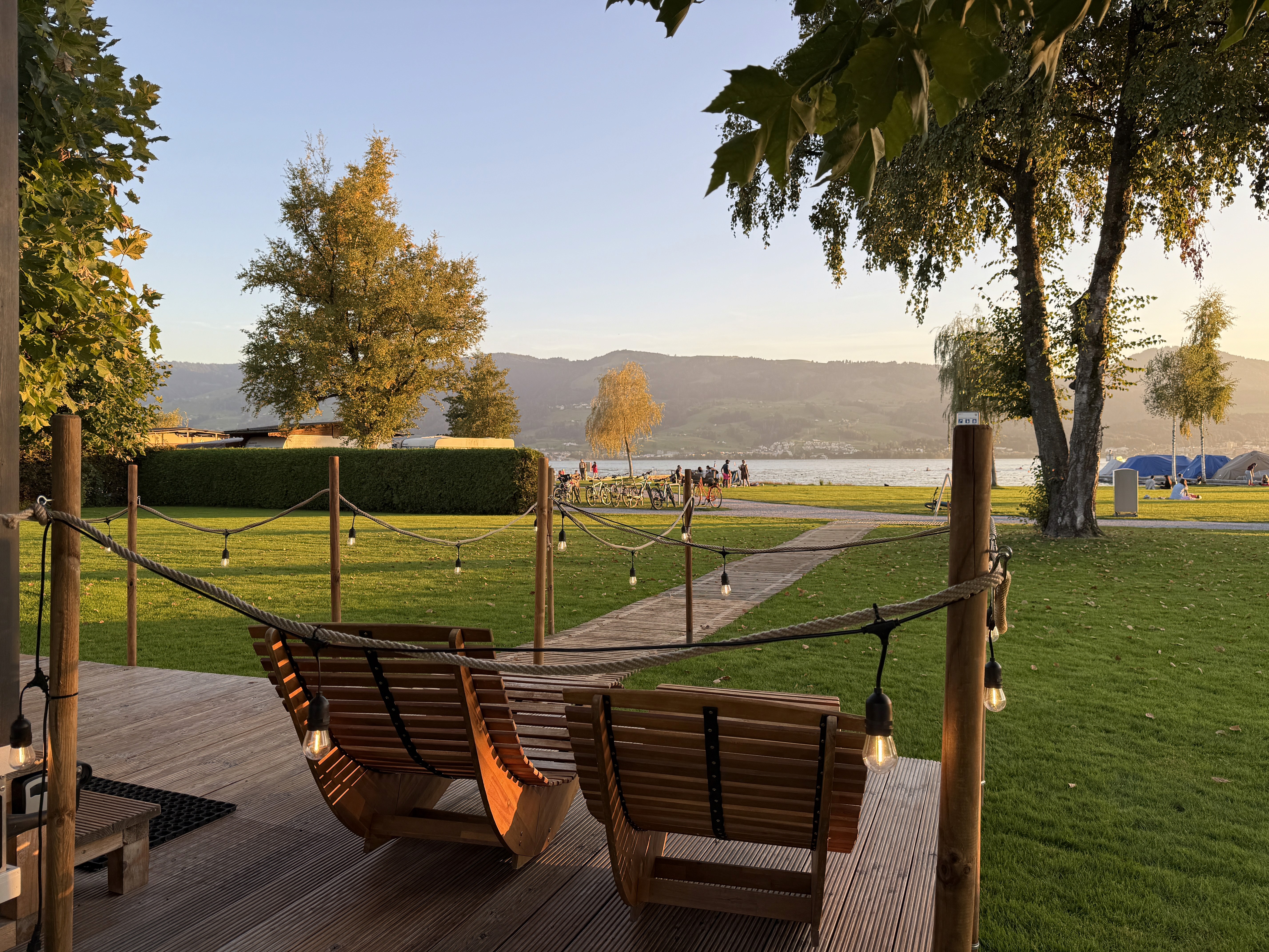 Duschen und Seezugang: Eine Kaltwasserdusche befindet sich neben den öffentlichen Toiletten. Der Zugang zum See kann über den Holzsteg erfolgen oder direkt vom Strand.